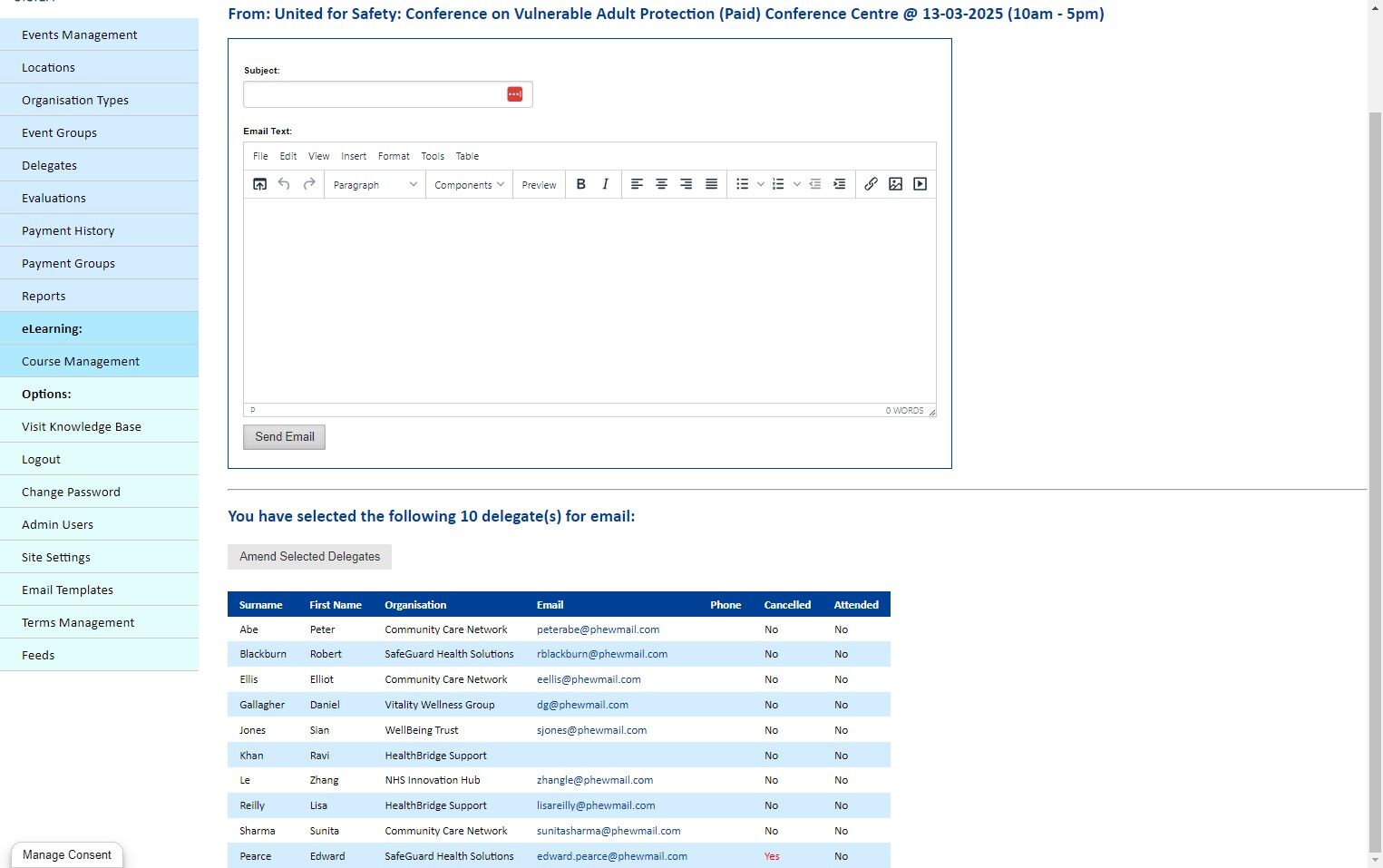 Once your email is ready to send, click on the Send Email button and all selected delegates will be contacted.
