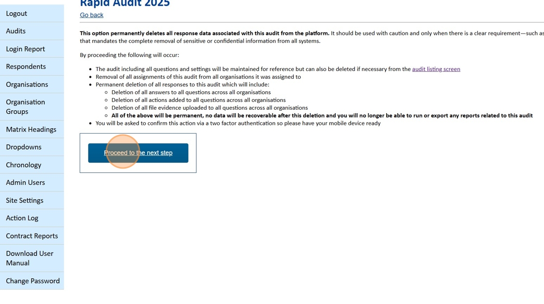 Read the following message carefully to understand the implications of deleting the data. When you are sure you wish to continue, click on the Proceed to the next step button.