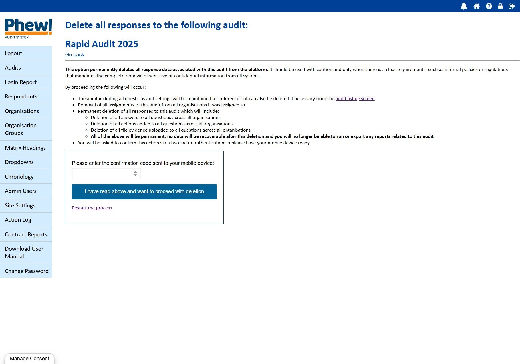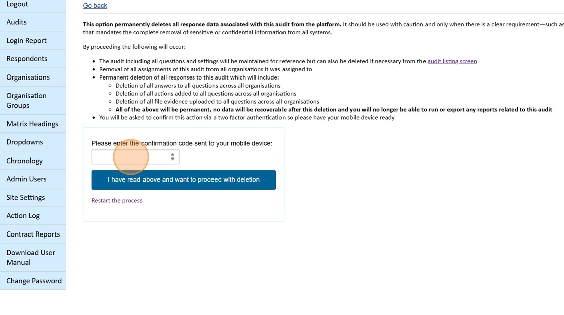 You will be sent a confirmation code to your registered mobile device. Please enter this code and click the 'I have read above and want to proceed with deletion' button.