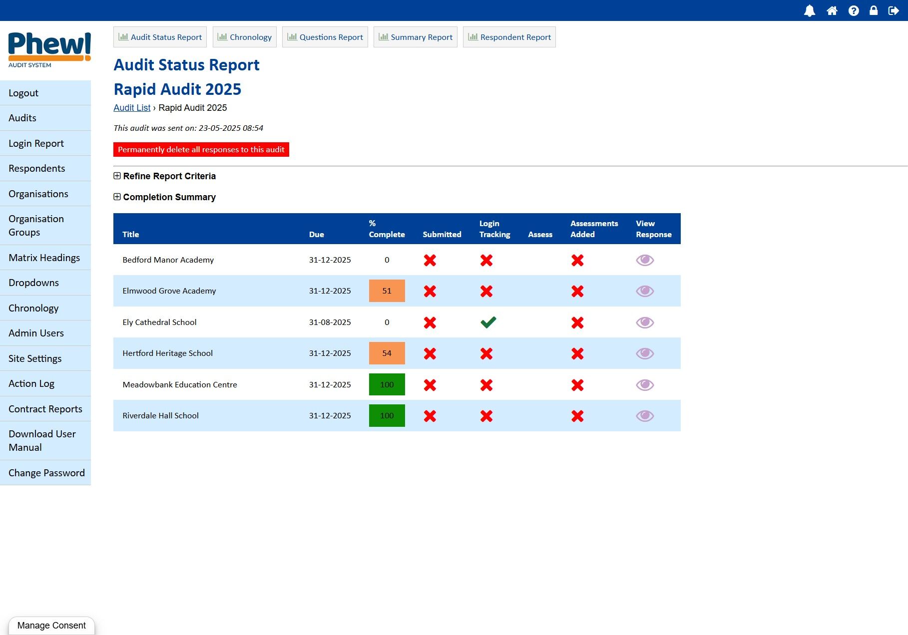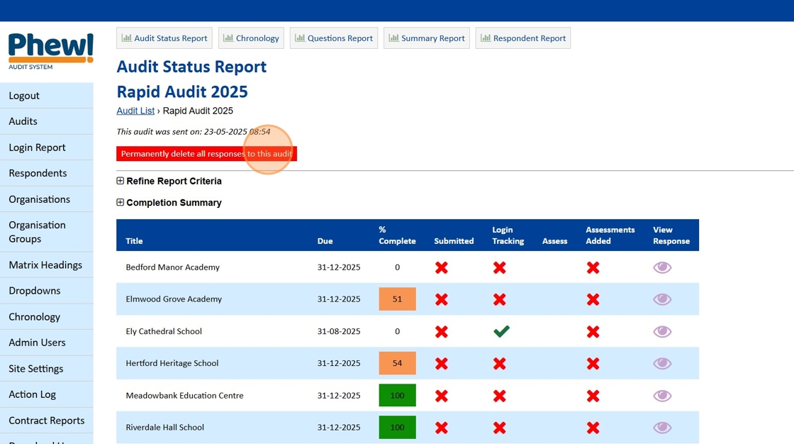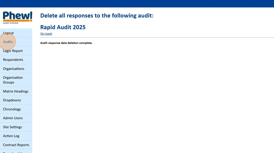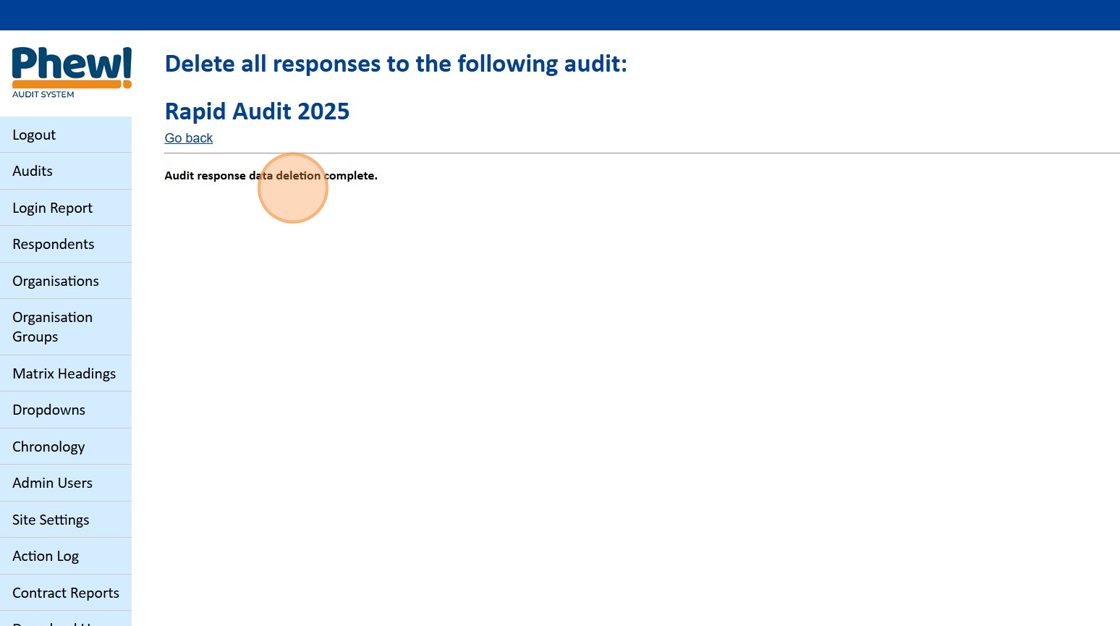 From the Audit Status Report click on the Permanently delete all responses to this audit button.