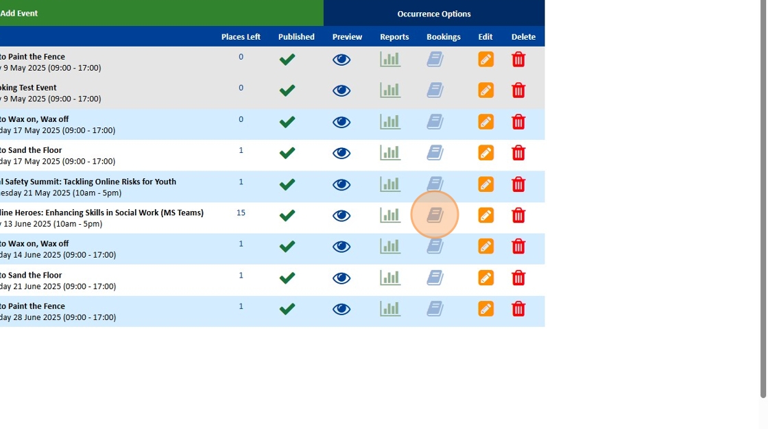 From the Occurrence View, click on the Bookings icon next to the occurrence the delegate is booked on.