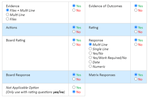 - Board Rating: Yes or No are you as a board going to rate the respondents using your chosen scale - can only be used if the Ratings option is also selected