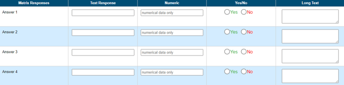 The Matrix Option allows you to group answers to questions in a table format and can link with Dropdowns if necessary. This allows you to have multiple underlying questions in a table format rather than several questions (see the examples below).